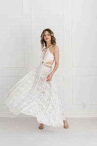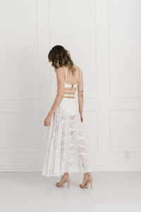 Designed for any bridal activities in the sun or by the pool, the Pearl Beaded Beach Dress by PatBO is an elevated, bridal-inspired take on the beach dress. Embellished with pearl detailing for the ultimate bridal nod, the built-in bodysuit peeks out from airy, netted lace while geometric cutouts hug the sides of the body. Pairs well with strappy sandals and a mojito in hand.