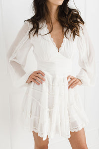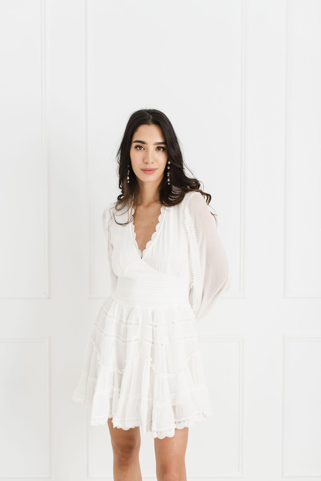 Known for their stunning intricate details, ROCOCO SAND does not disappoint with this rendition of the Mia Dress. Romantic elegance at its best, this long sleeve mini dress feature stunning detail from every angle. Effortless chiffon flows with your move. An easy wardrobe staple for all your wedding events.