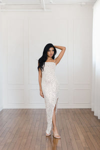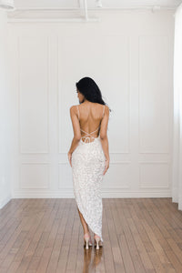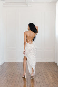 - Finished in white crystal sequin textile on stretch mesh base- Please note, due to the raw edge on the inside of the dress, it is characteristic of this style to have some sequins shed during wear.