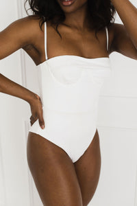 Sleek, yet structured the Ezra one-piece by Revel Rey features an underwire to add support in all the right places.  Optional straps allow for maximum flexibility and a chic cut out back. A gorgeous and flattering white suit to take you from beach to bar or through any of your wedding events.