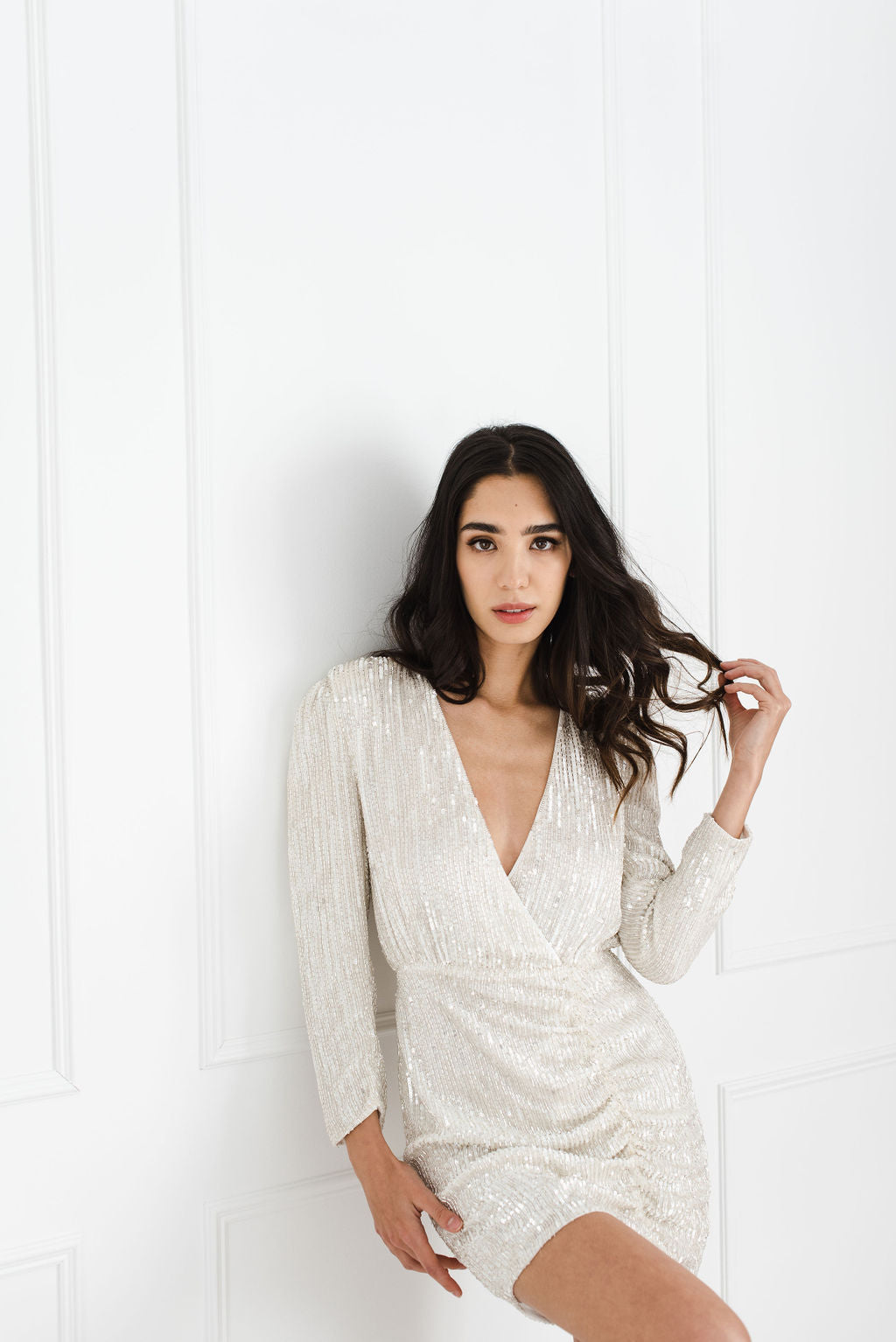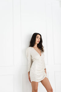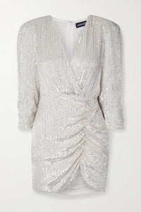 Bring on the glamour, the retrofete Stacey dress is sure to make a statement. Chiffon is hand-embroidered with stunning ivory-coloured sequins and beading, the design features subtle ruching on the skirt and a wrap-effect silhouette with invisible back zip closure.
