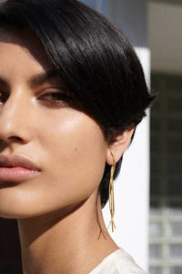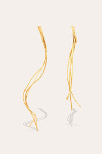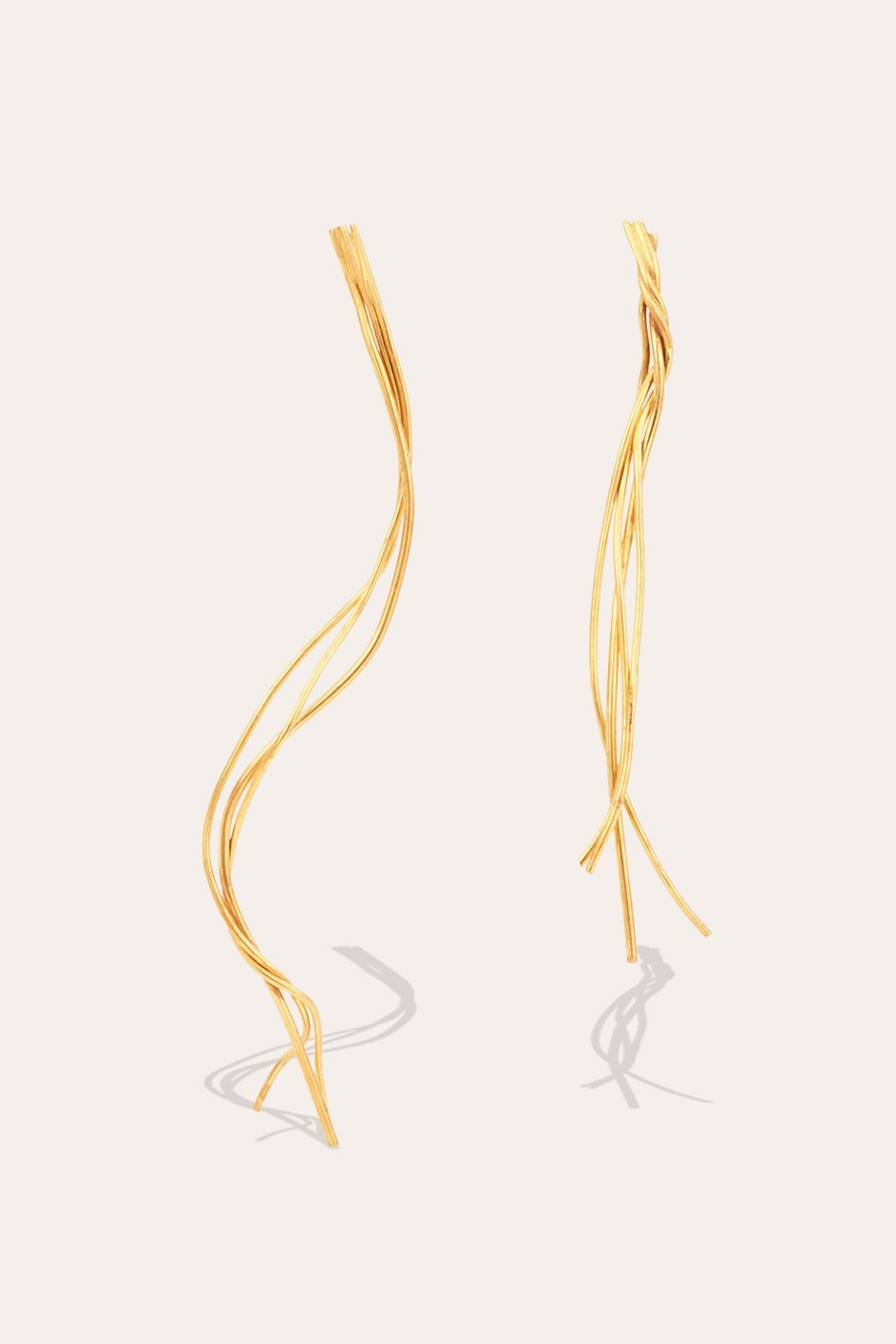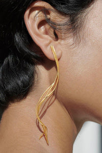 Elegant, modern and minimal. The Gold Vermeil Drop Earrings by completedworks feature strands of 14k gold vermeil handmade from recycled silver that gently twist downwards in an asymmetric design to jaw grazing height. They are secured with earring posts and butterfly backs.