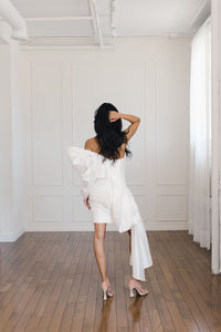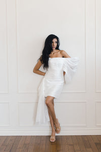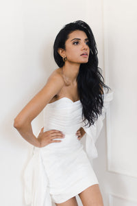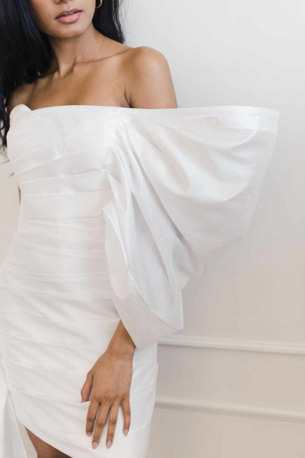 The Plisse Pleat Asymmetric Dress from Helen O’Connor is a testament to the beauty of ultra-modern bridalwear. A single statement sleeve and one-sided midi train create their own kind of balance, adding head-turning drama to a classic gathered mini dress.