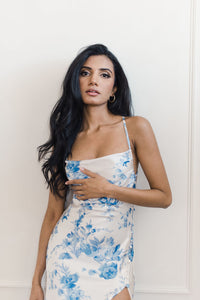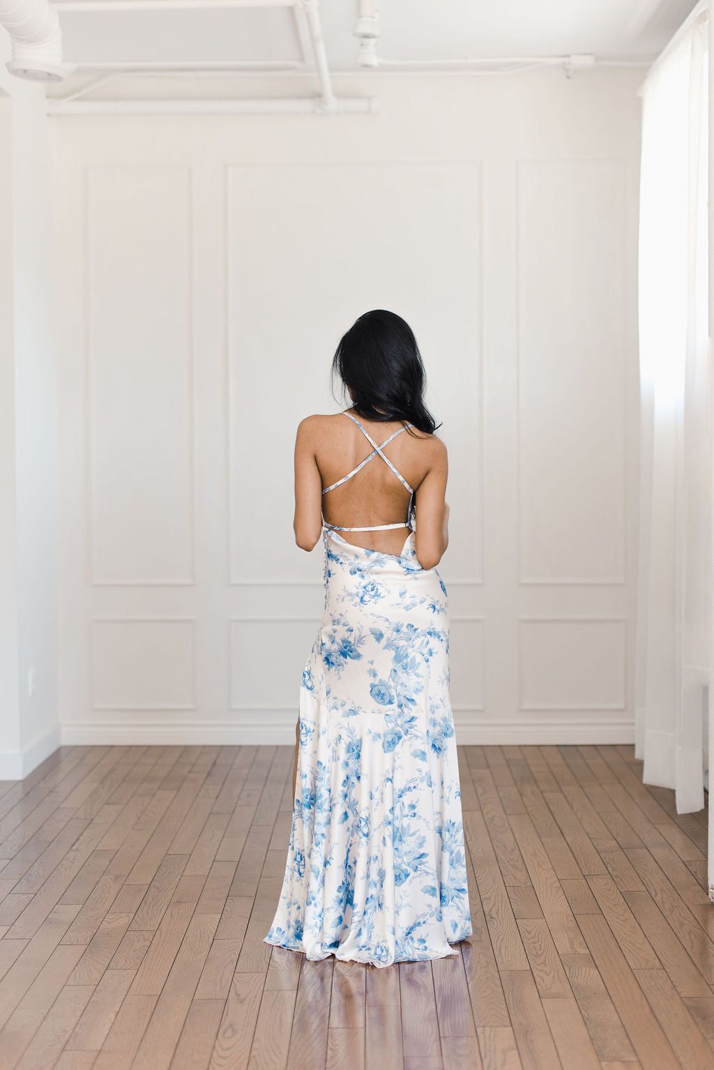 The Isla dress by V. Chapman proves what the Afterwhite bride has known all along: less is definitely more. A classic cowl neckline and vintage-inspired blue floral print are offset by a draped open back, thin criss-cross straps, and dramatic side slit for an elegant show of skin.